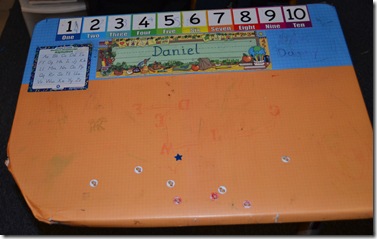 My “desk” consists of three stackable storage bins topped with a fabric covered board. I keep the kids’ school books in the bins so they will be easy for me to access for planning and for days when we choose to work outside. On top of the bins, I keep my notes for the day, a stapler, and a few erasers.